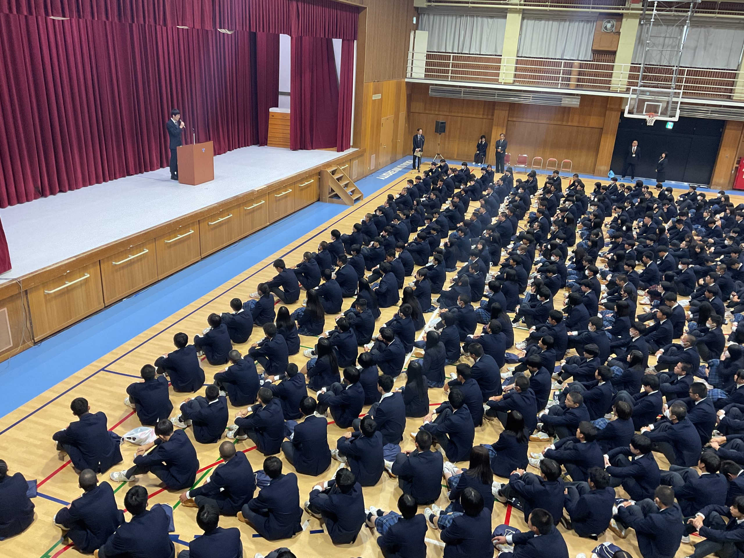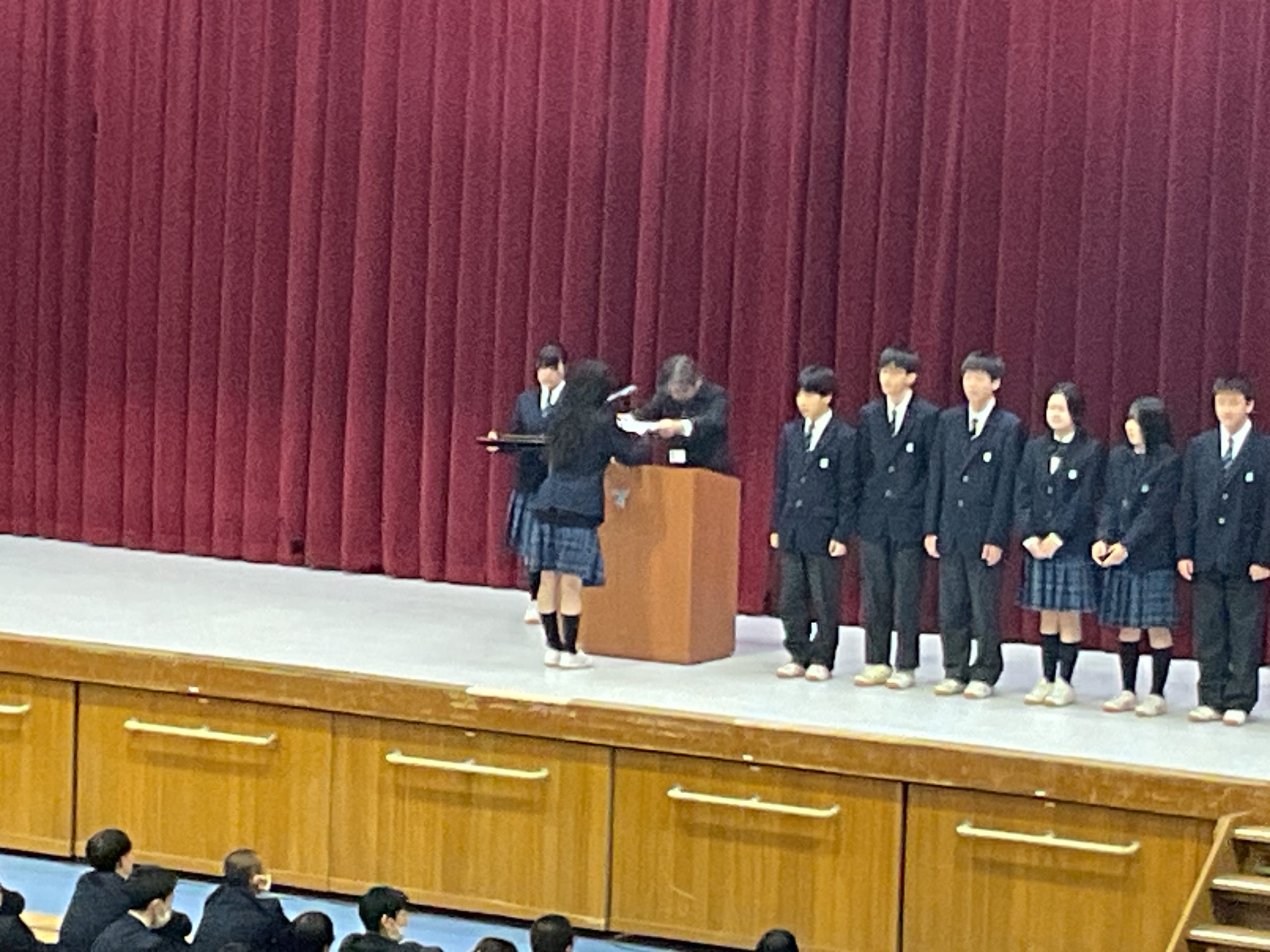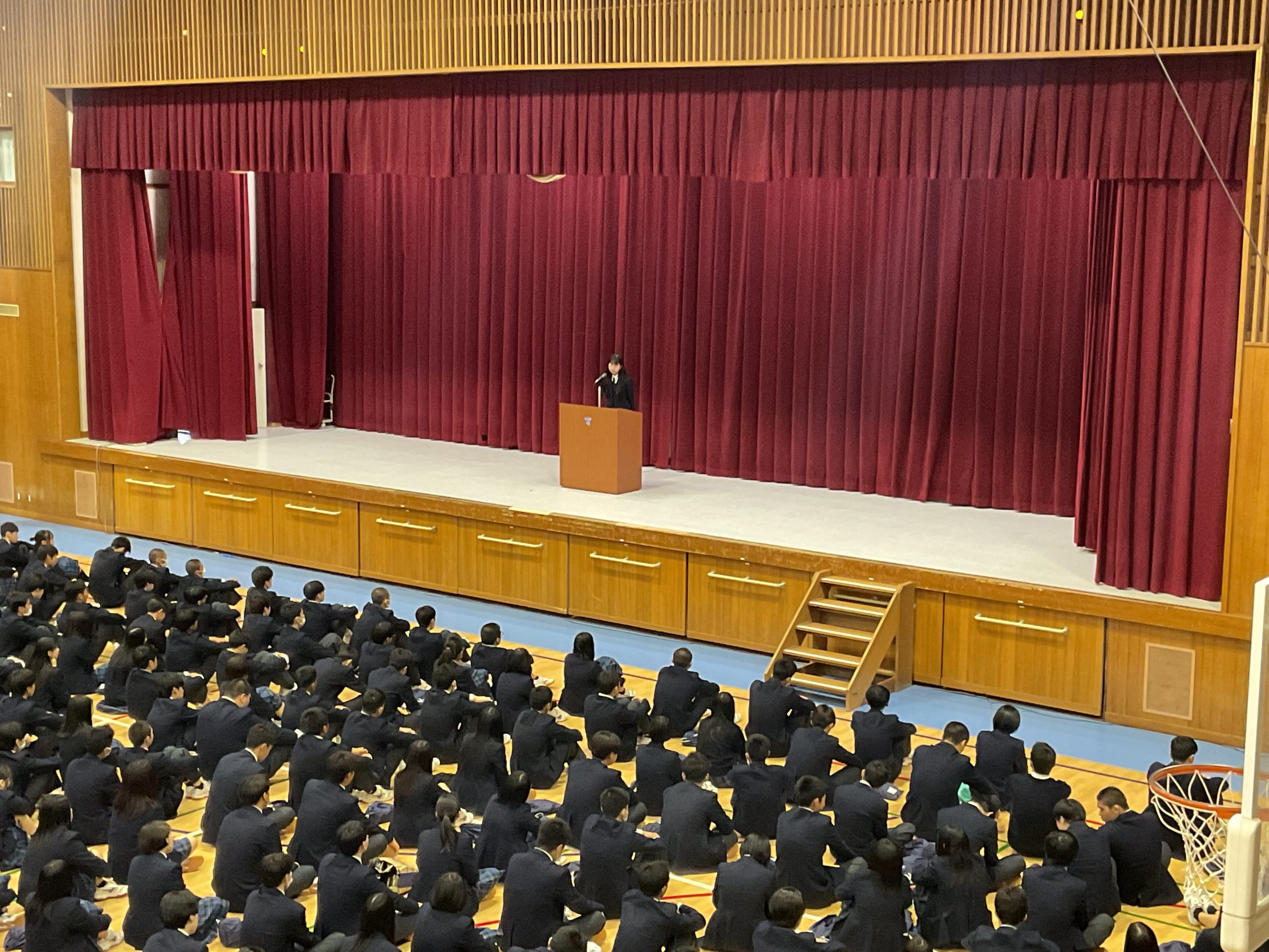 10/1、後期の始業式を行いました。教頭先生から、5か月後に卒業を迎える3年生へのエールと、何かを始める日にしてほしいというメッセージが送られました。その後に続いた任命認証式で、生徒会長2期目となる本多永さんからは、「常に学校全体のことを考えて行動をしたい」という所信表明が行われました。 気持ち新たに学年の後半のスタートを切ってほしいと思います。