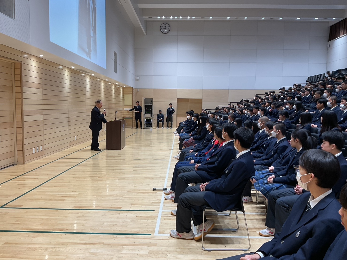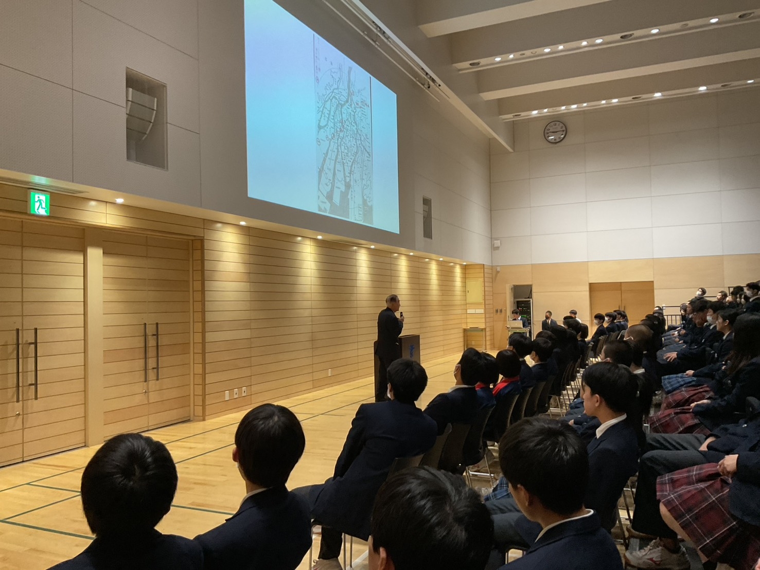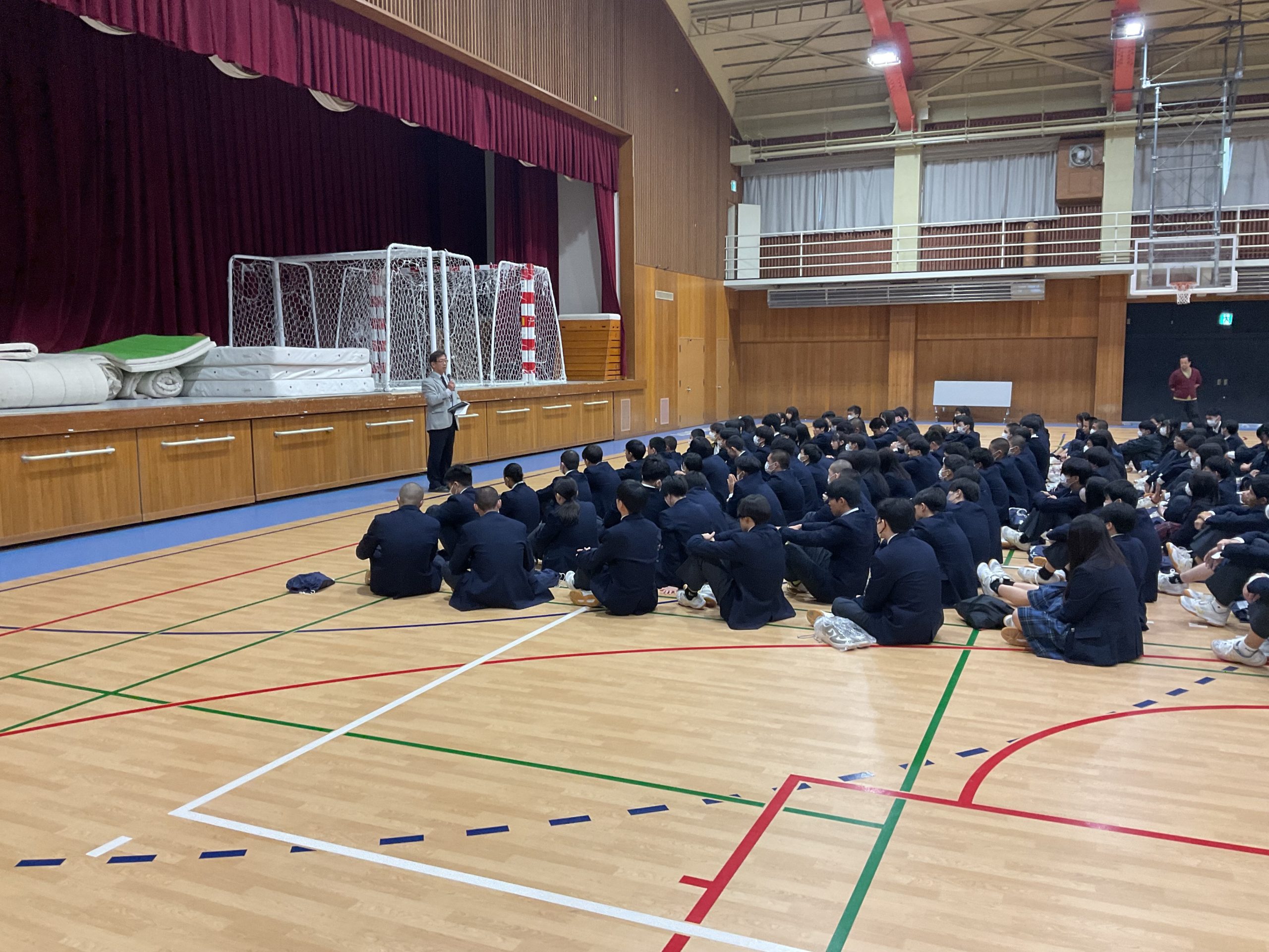 研修旅行に向けたキャリア教育の一環として、 講堂にて平和教育を行いました。