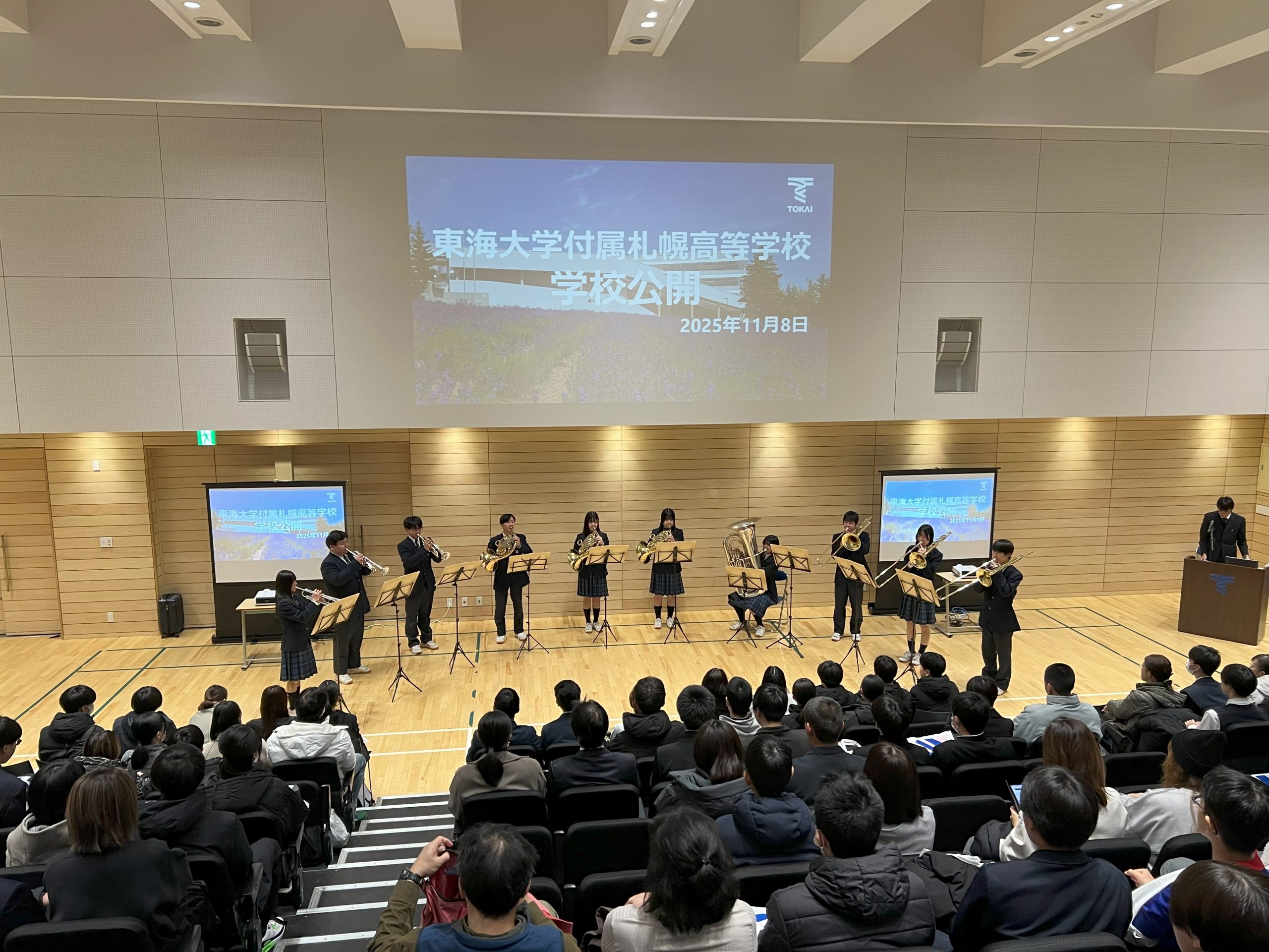 1部2部の2グループに分け、前半は全体の説明会、後半はスタンプラリーで校内を巡りながら各種体験を行っていただきました。 吹奏楽部・金管セクションのファンファーレでスタートしたの全体説明では、学校説明以外にも入試科目5教科の担当者から入試に向けた学習のポイントを話しました。後半は校舎内で各文化部の体験や各種質問に生徒が答えるコーナー、制服試着体験などを行いました。また、各コーナーにスタンプを設置して、スタンプを集めてくれた参加者には粗品をプレゼントさせていただきました。