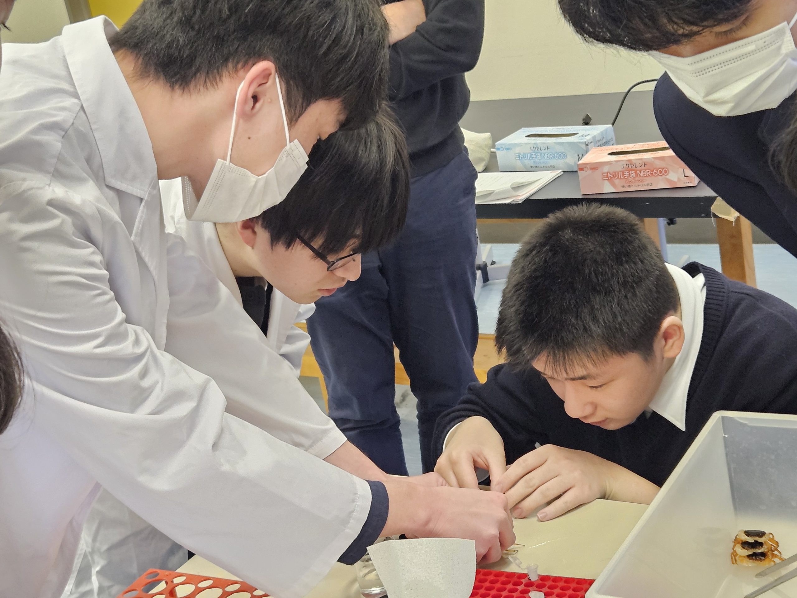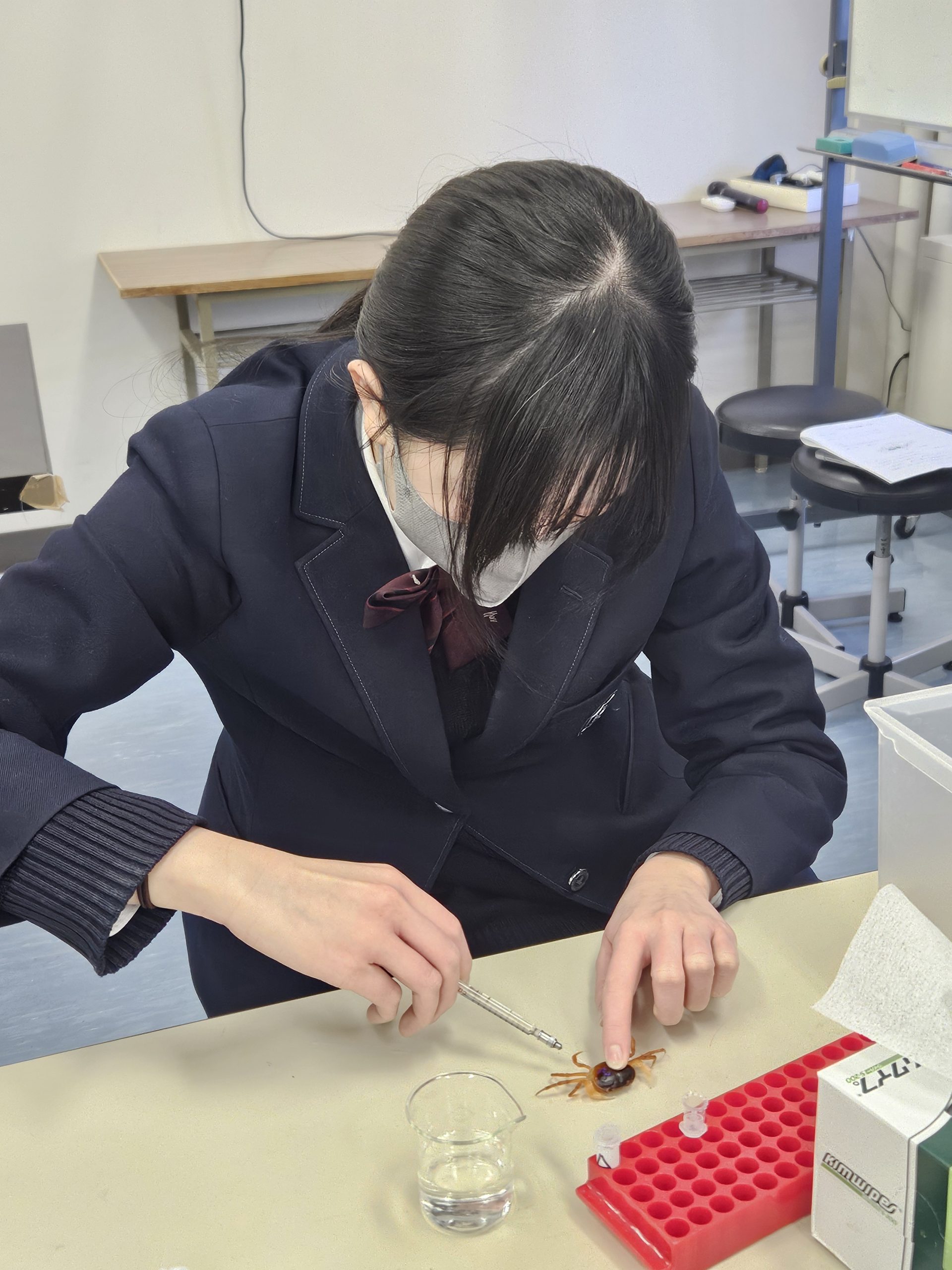 今回、東海大学の先生のご協力の下、外来種であるアズマヒキガエルの毒について、実験研究を行いました。アズマヒキガエルの毒が生物に与える影響について、サワガニアッセイという方法を用い、調査しました。大学の先生や大学4年生の指導の下、普段は行えない手法で調査することができ、良い経験となりました。サワガニに対してアズマヒキガエルの毒はあまり強い作用を持ちませんでしたが、今後も継続的に観察や実験を進めていきます。