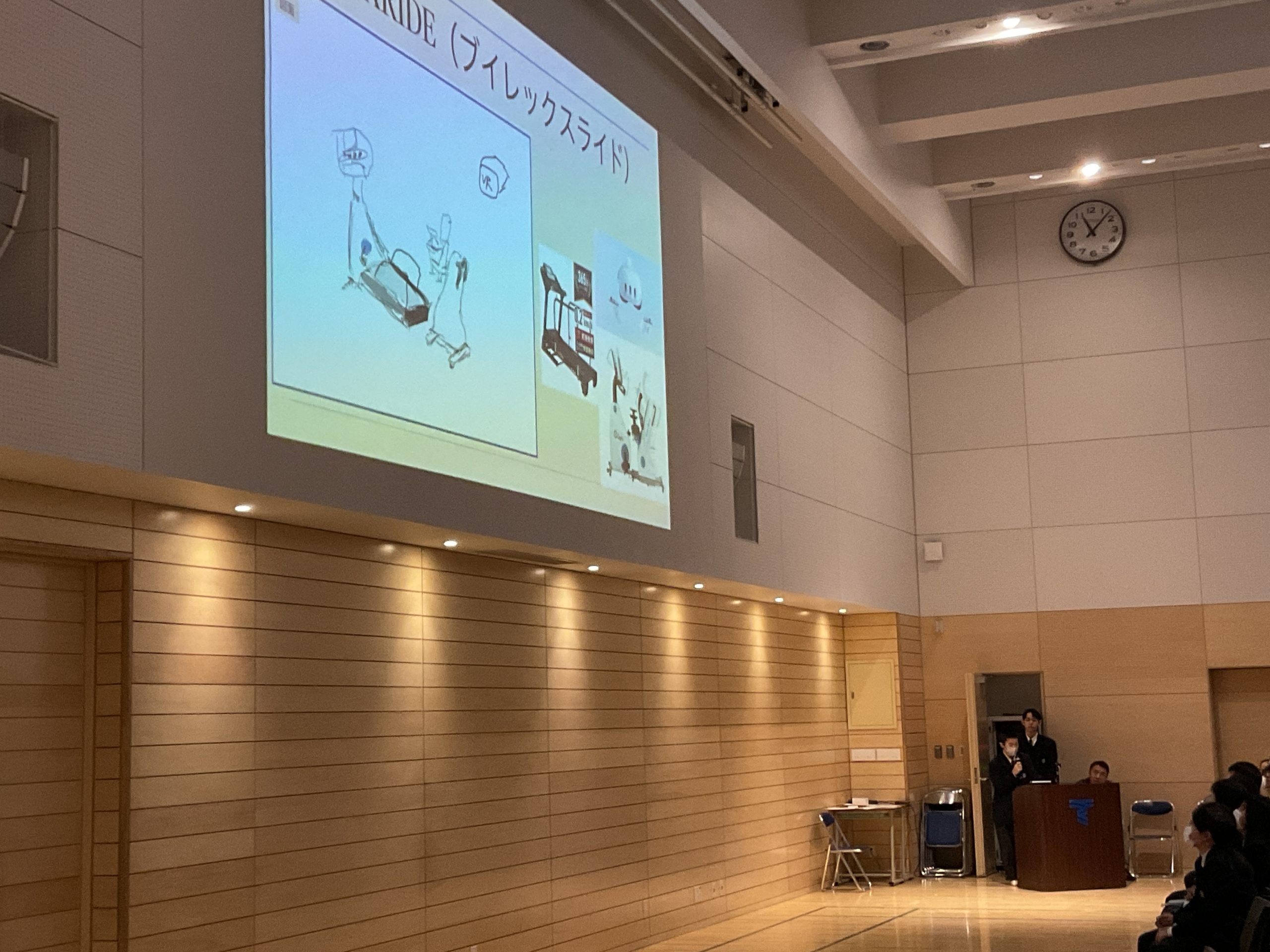 本校講堂にて「 福祉に貢献する発明品を考えよう 」というテーマのもと、各クラス内で発表後、選出された代表2名の合計16人による学年発表会が行われました。