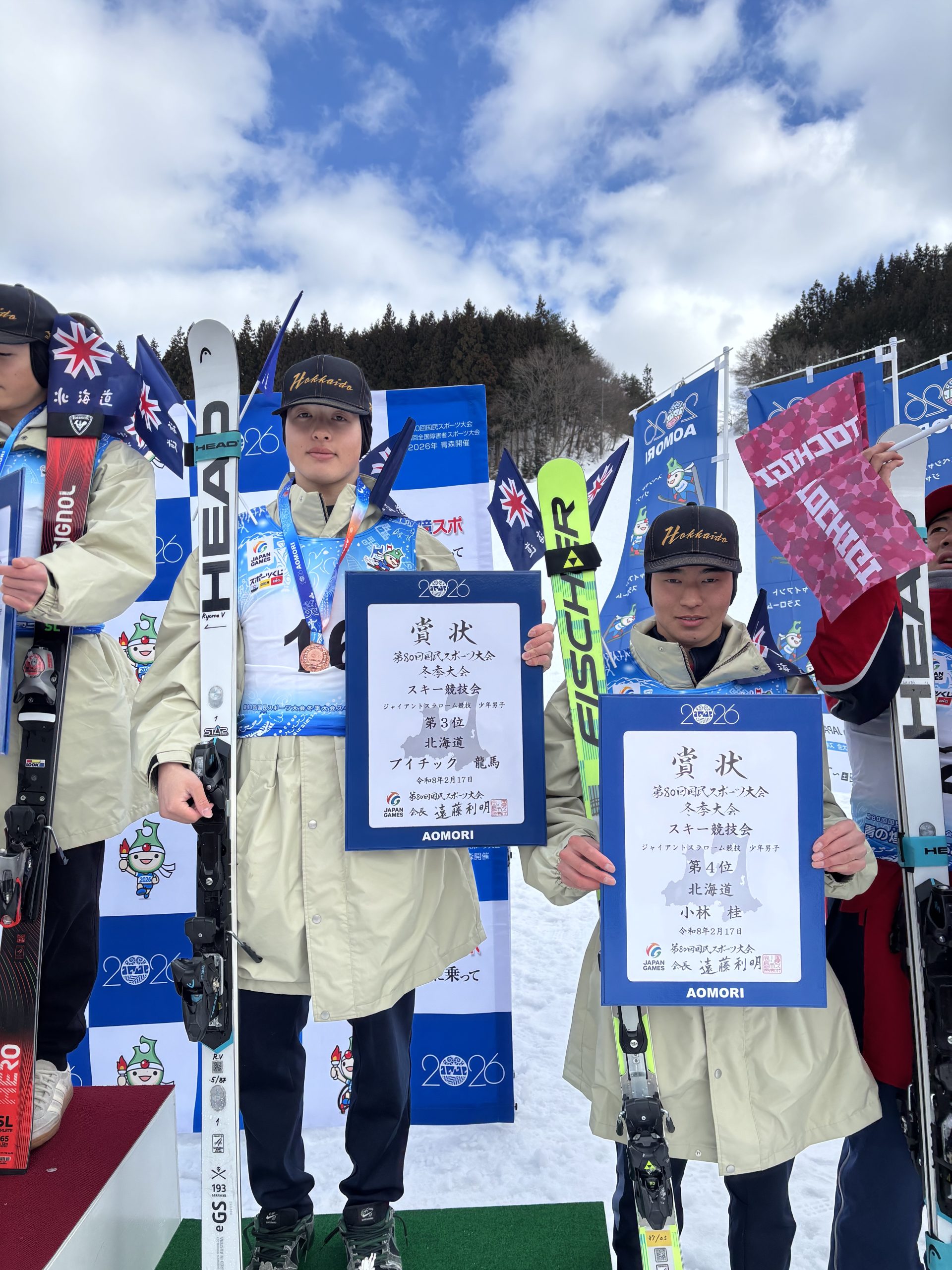 青森県大鰐スキー場で行われたジャイアントスラローム競技には、ともに3年の小林 桂さん、ブイチック龍馬さんが出場、今月はじめに開かれたインターハイで2人はジャイアントスラローム、スラローム競技で惜しくも2位となっており、そのリベンジを目指して挑みました。結果はブイチックさんが3位、小林さんが4位となり、優勝は逃しましたが、2人とも昨年のこの大会に続いて入賞する頑張りを見せてくれました。