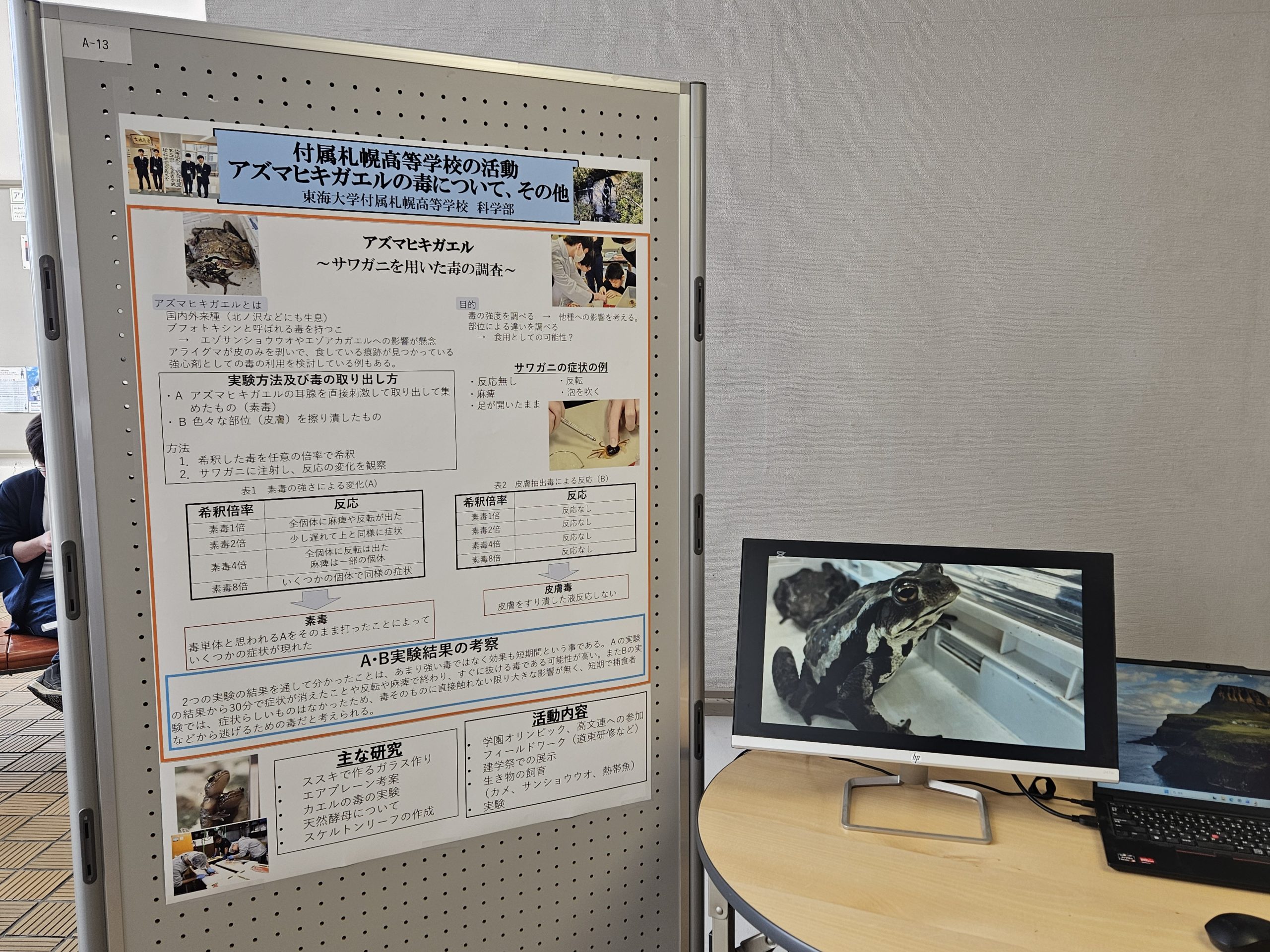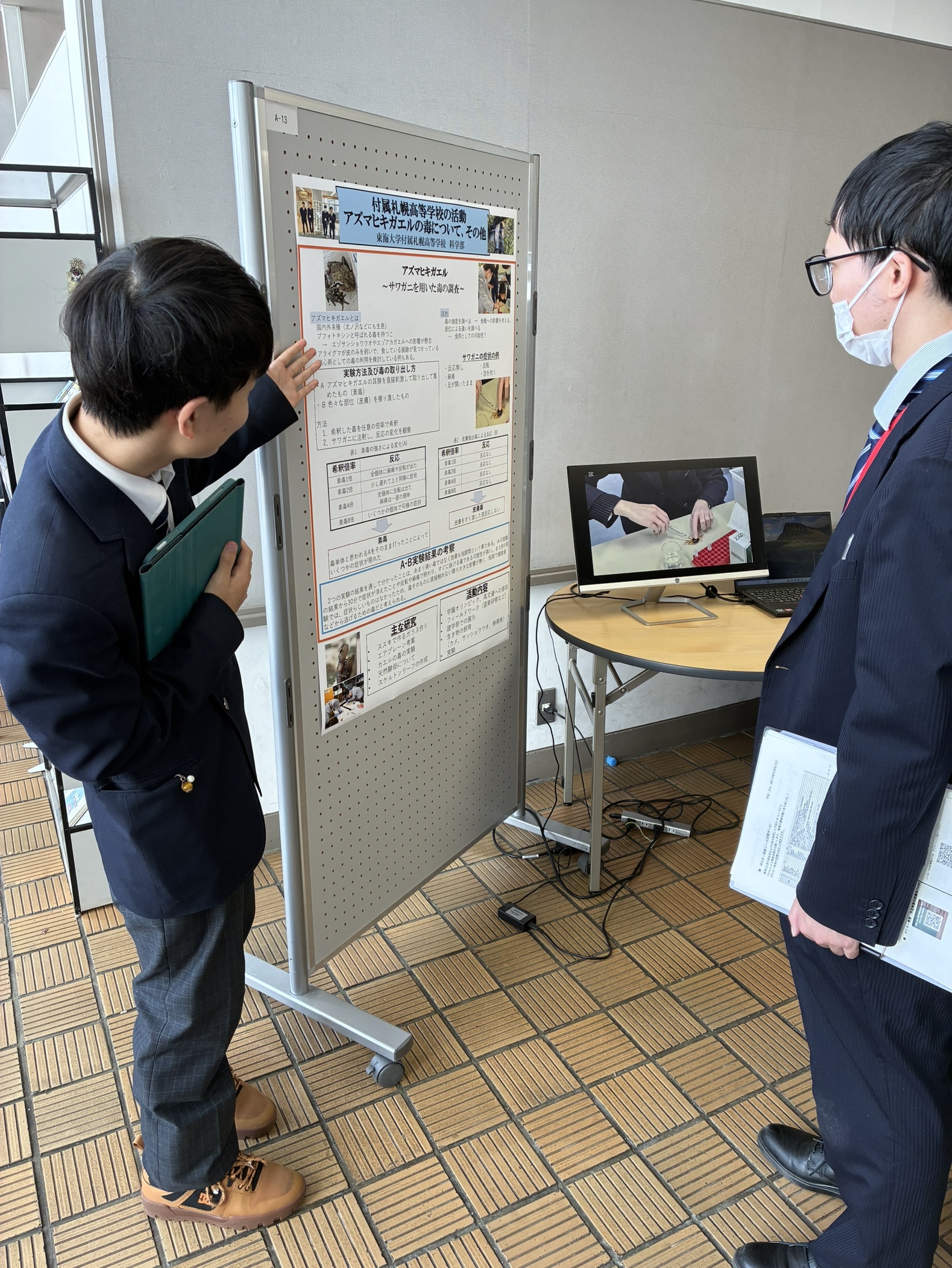 2月26日に東海大学札幌キャンパスで行われた「学術・文化・課外活動交流会」に参加させていただきました。科学部で行った研究を中心に普段の活動をまとめたポスターを作成し、掲示しました。当日は定期試験と重なったため、短時間の発表・見学となりましたが、大学の様々な研究を見たり、大学生や先生方に自分たちの研究を聞いていただき、大きな学びの場となりました。