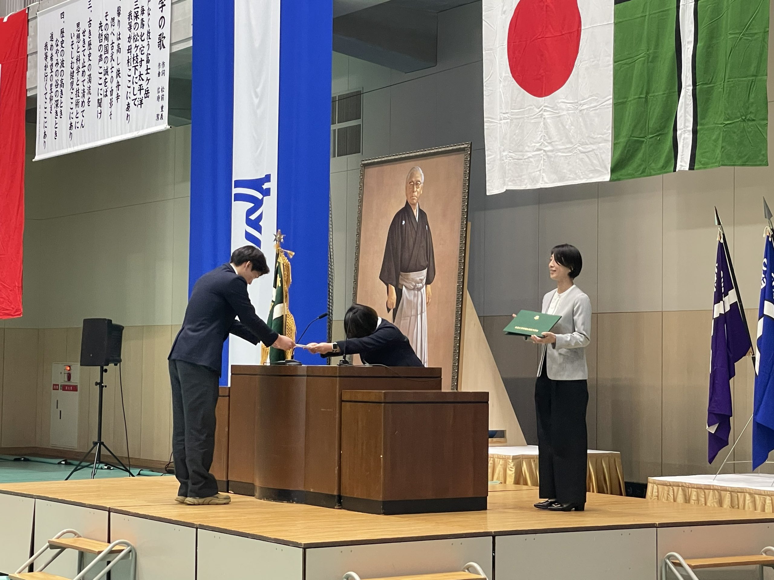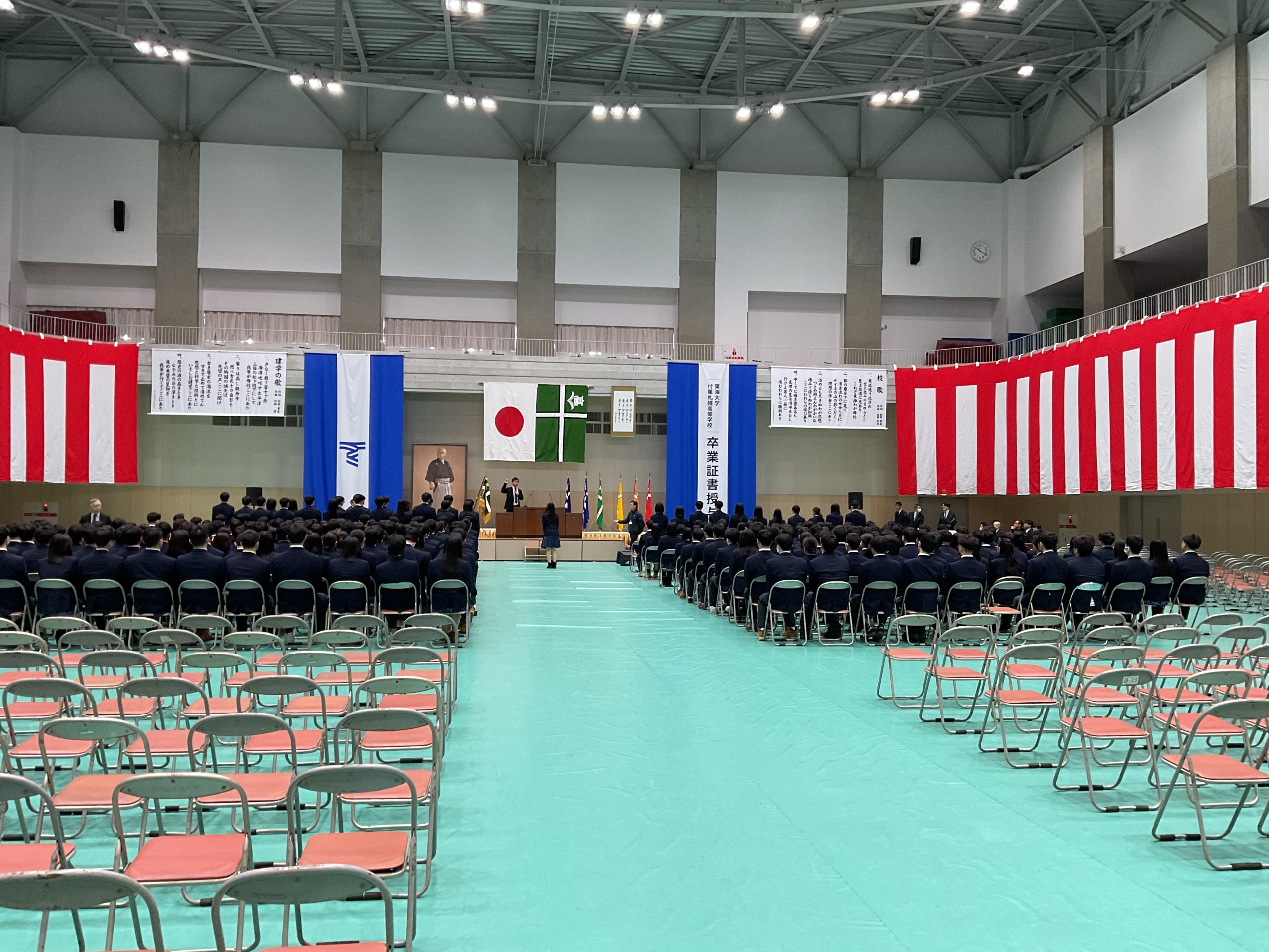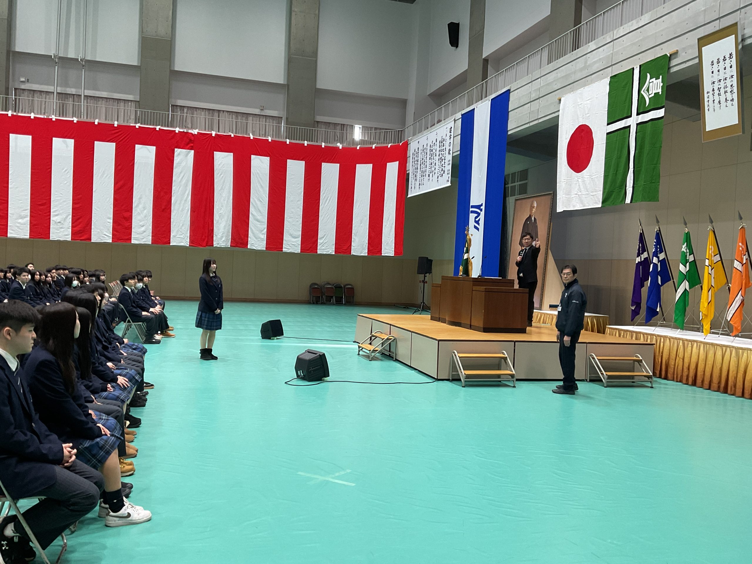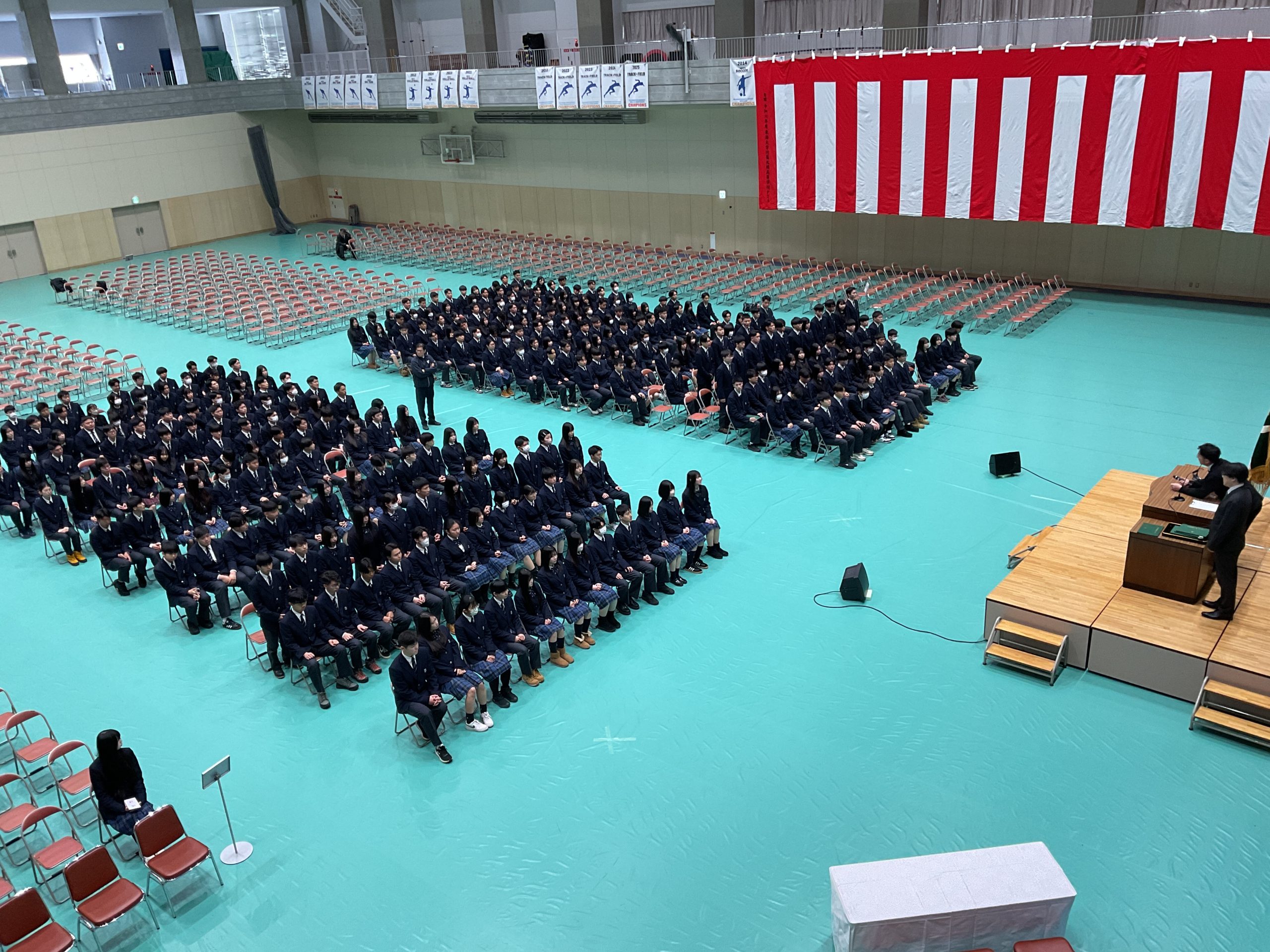 昨日在校生を中心に設営された卒業式会場・東海アリーナで、教頭先生や学年主任の先生を中心に、式全体の流れや一つ一つの動きの確認を行いました。校歌や建学の歌斉唱の練習では、これまでの学校生活の節目節目で歌唱練習してきた成果がしっかりと発揮された元気な歌声を響かせることができました。 また、予行演習終了後、同窓会の入会式も併せて行いました。同窓会から澤田様、安部様が登壇され、記念品である卒業証書ホルダーの紹介や、各クラス代表者への「同窓会会長賞」の授与も行っていただきました。